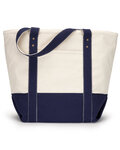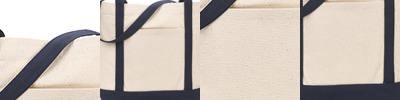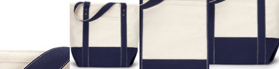 16 oz. sturdy cotton canvas; 23" reinforced webbed handles; Large zippered main compartment; Front slash pocket; Zippered interior pocket; Antique brass rivets; 5"w x 4 ½"h approx. front pocket center imprint area; 3"w x 2 ½"h approx. front pocket center embroidery area;