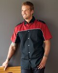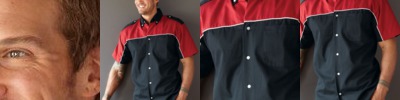 3.3 oz. 55/45 cotton/polyester; 2 chest pockets, button flaps; Front stitching and on yoke; Blue & red have black inner collar; Hem sleeves and bottom;