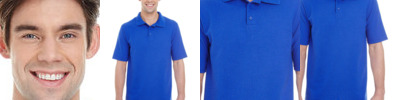 6.8 oz., 50% ringspun cotton, 50% polyester; All cotton content is U.S. grown; Double-needle hem sleeves; Three-button placket, dyed-to-match chalk buttons; Self-fabric neck taping and welt collar;