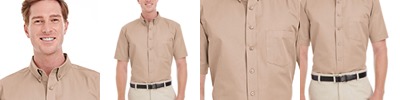 6.05 oz./yd² / 205 gsm, 100% cotton twill with Teflon™; Button-down collar with structured collar stand; DTM buttons; Two-button adjustable cuffs;