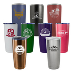 20oz. double wall vacuum stainless steel tumbler with copper lining. Press in, twist closure lid. Keeps liquid hot for 5.50 hours and keeps liquid cold for 24 hours. Complies with Prop 65.