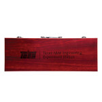Back yard BBQ tools for the grill master in your life. Includes: spatula, tongs, and fork with rosewood finish handles. They are not dishwasher-safe; hand washing recommended. Box lid and tools are laserable. Tools are Stainless Steel. Tool handles and box are Rosewood finish.