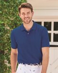 100% polyester piqué knit 4.87 oz/yd2 (equiv. to 8.11 oz/lyd, 165 gsm). Made exclusively with TopShield™ moisture management treatment. This hi-tech treatment applied to the fabric wicks moisture away from your body, keeping you comfortable and dry. Anti-microbial treatment inhibits the growth of odor-causing bacteria leaving you feeling fresh.