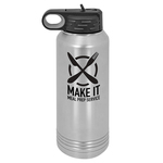 Stainless Steel Double Wall Vacuum Insulated Polar Camel Water Bottle, 32 oz. size. Includes screw-on lid with flip top and a soft rubber finger hold. Raised ridges for easy opening and closing, and a rigid & removable straw for easy cleaning. 2X heat and cold resistant when compared to glass or plastic bottles. Fits most cup holders. Not recommended for dishwashers, hand wash only. Measures 10 5/16″ H, Base has a 3 11/16″ diameter. Custom Laser Engraved Logo included logo lasers to Black.