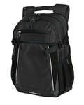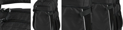 600D polyester, 420D polyester; Front pocket with hook and loop fastener; Side mesh water bottle pockets; Top zippered pocket ideal for storing a smartphone; Front compartment with multi-function organizer and padded tablet pocket (fits up to a 10" tablet); Large, zippered main compartment; Easy-access, padded laptop compartment with zippered closure (fits up to a 15"Laptop); Sport-mesh padded, adjustable backpack straps and integrated top grab handle; 13.25"W x 18.5"H x 8"D;