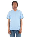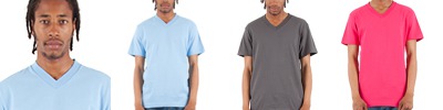 5.9 oz., 100% USA cotton, 18 singles; Heather Grey is 90% USA cotton/10% polyester; Shoulder-to-shoulder neck tape; 1" double-needle stitched sleeve and bottom hems; 7/8" Seamless non-topstitched v-neck collar; Heat transfer label; Quarter-turned to eliminate center crease; Forward-thrusted shoulder seam for comfortable neck fit;