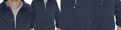 100% nylon; Inside pocket; Snap front; Hand-warmer pockets; Drawstring bottom, elastic cuffs;