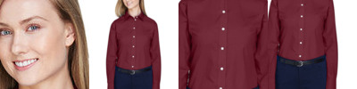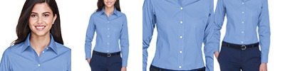 4.1 oz., 60% cotton, 40% polyester; fine yarn count shirting; true Non-iron performance straight from the dryer; patented pucker-free seams; specially fused collar, cuffs and placket; split back seam with bias cut back yoke; pearlized buttons; straight collar; front and back princess seams for flattering feminine fit; bust darts for a flattering feminine fit.