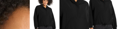 6.5 oz., 60% cotton, 40% polyester singledyed sueded fleece; 1x1 yarndyed stripe pocket trim; Self fabric cowl neck with off-white drawcords;