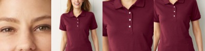 Contoured side seams and 4-button placket add dash to this stain-resistant jersey knit shirt.